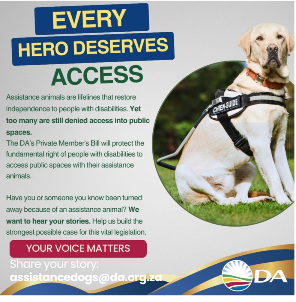 We are working with the Democratic Alliance to change the laws in South Africa to give handlers with their assistance dogs rights.